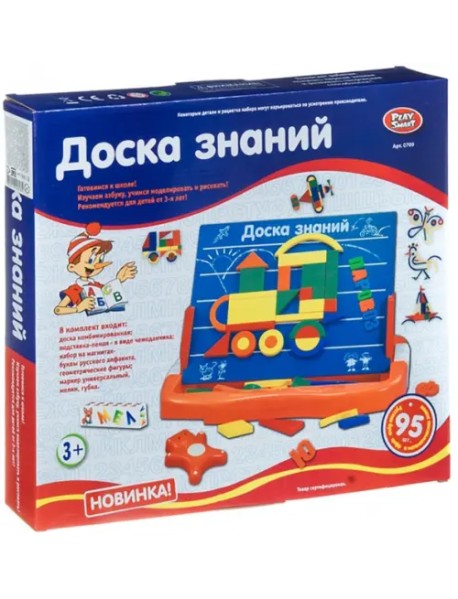 Обучающая магнитная "Доска знаний" удобна для обучения и подготовки ребенка к начальной школе. С помощью набора "Доска знаний" можно отточить навыки счета, письма и рисования. На специальной полочке можно хранить все необходимые принадлежности. В наборе магнитно-маркерная доска, специальный маркер, буквы-магниты, геометрические фигуры, мелки, губка для стирания, пенал-подставка для доски.