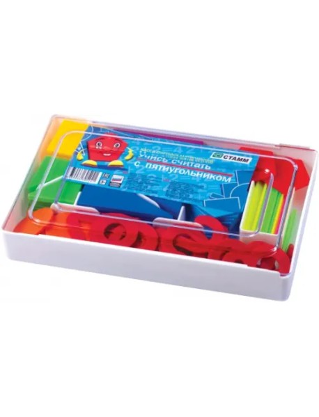 Разноцветные фигуры: прямоугольник, квадрат, шестиугольник, пятиугольник, круг по 10 штук, треугольники 30 и 45 градусов, по 20 штук, цифры и знаки - 32 штук, счетные палочки 20 штук.
