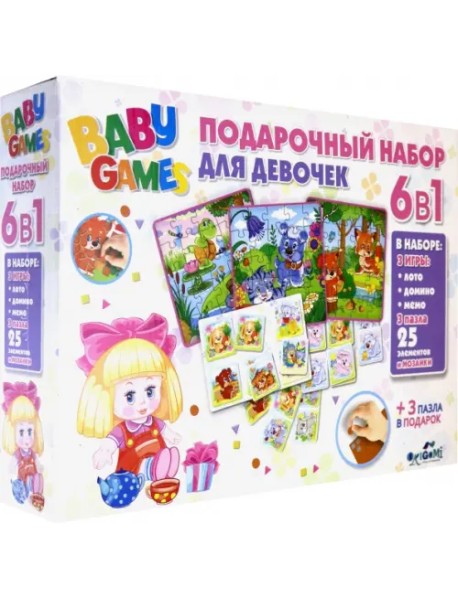Подарочный набор 6 в 1 «Для девочек» — это уникальный набор, включающий в себя интересные красочные пазлы с милыми зверятами, будто сошедшими в детских открыток, а также целый ряд развивающих и обучающих настольных игр, благодаря которым ребенок узнает, что такое лото и домино, а также потренирует память.