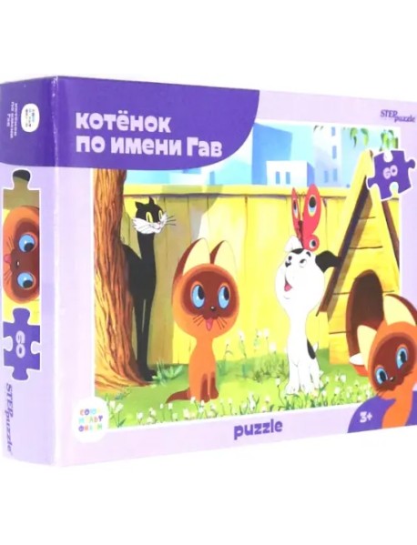 Пазл "Котенок по имени Гав" состоит из 60 элементов. Здесь на картинке мы видим трёх главных героев: самого Гава, щенка Шарика и большого черного кота.