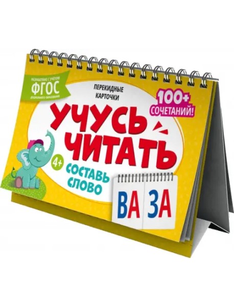 Карточки перекидные обучающие, сброшюрованные, 210х150 мм, полноцветная печать, обл - мелованная бумага 250 г/м?, глянцевая ламинация, гребень, Внутренний блок разделен на две части, что позволяет собирать различные сочетания слогов и слов.