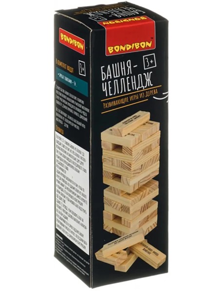 Постройте 18-этажную башню из блоков, где каждый этаж состоит из трёх блоков, расположенных вплотную и параллельно друг другу. При этом блоки каждого последующего этажа размещены перпендикулярно блокам предыдущего этажа. Задача игроков заключается в том, чтобы по очереди извлекать по одному блоку из любого уровня башни за исключением самого верхнего и размещать его на крыше конструкции таким образом, чтобы можно было надстроить еще один этаж. Однако, прежде, чем положить блок на крышу, участник должен выполнить написанное на нем задание. Игра заканчивается в случае падения башни. Проигравшим считается игрок, последним вытащивший блок перед обрушением конструкции.