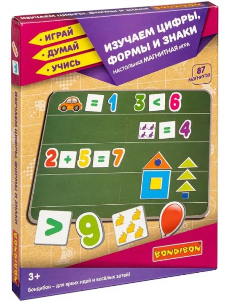 Изучай цифры, знаки, формы и цвета, решай примеры, размещая цифры и знаки на магнитной доске. Составь пример на доске и попроси друга дополнить его правильным ответом.